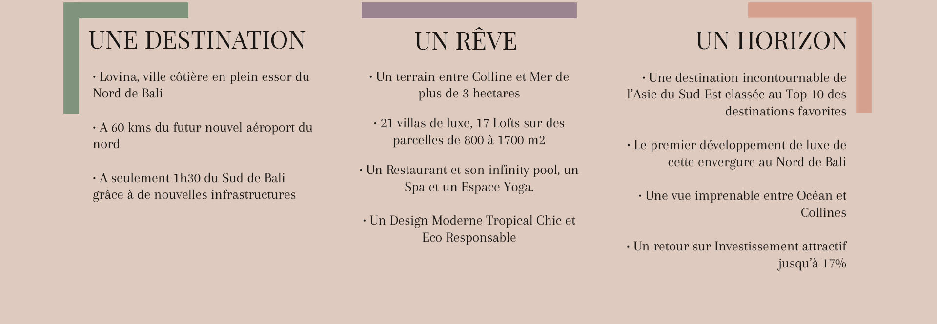 Un complexe de 21 villas et 17 lofts, à flanc de colline, vue mer, niché au milieu de cocotiers, et d'une forêt de tecks, unique dans le nord de Bali par ses espaces, la qualité de ses prestations telles que son restaurant, son spa, son espace yoga et sa conciergerie.